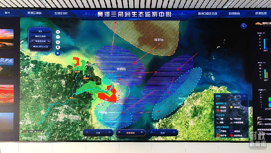 △监测中心大屏幕正在显示黄河三角洲水生生物场所,包括产卵场、索饵场、越冬场。(总台央视记者彭汉明拍摄)