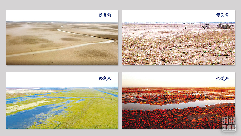 △黄河口河流沼泽湿地(左)和盐沼湿地(右)生态修复对比图。(总台央视记者卢心雨提供)