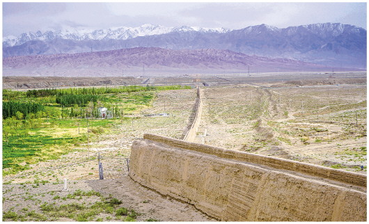 甘肃省山丹县新河驿段长城与公路并行。记者沿着河西走廊驱车行进,只见长城矗立在戈壁滩上,墙体方正整齐,与群山、戈壁相互融合,景象蔚为壮观。这段长城全长17公里,2017年修复约4公里,有围栏围护,防止羊群和游客随意攀爬,向外延伸的保护范围则用界桩明确标示。