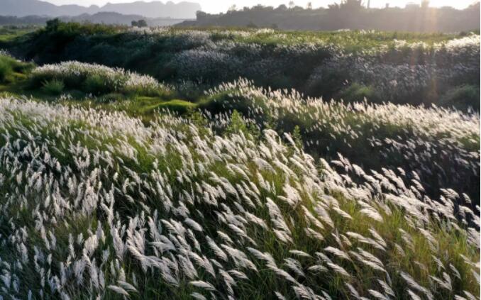 广西柳州市柳北区石碑坪镇古城村蚂拐岛上的千亩芦苇美景(无人机照片)。新华社记者黄孝邦摄