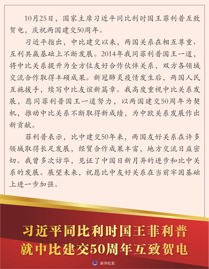 新华社北京10月25日电 10月25日,国家主席习近平同比利时国王菲利普互致贺电,庆祝两国建交50周年。