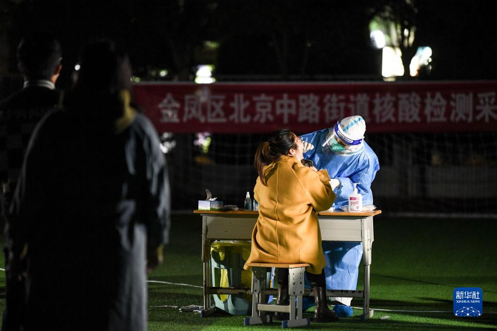10月23日,在宁夏银川市金凤区北京中路街道采样点,医务人员对居民进行核酸采样。新华社记者 冯开华 摄