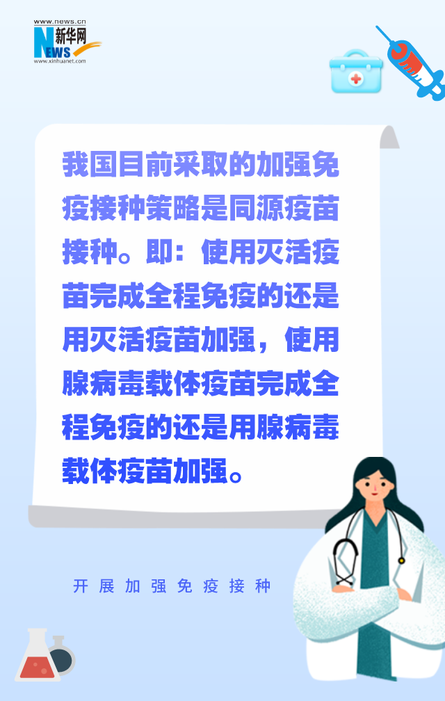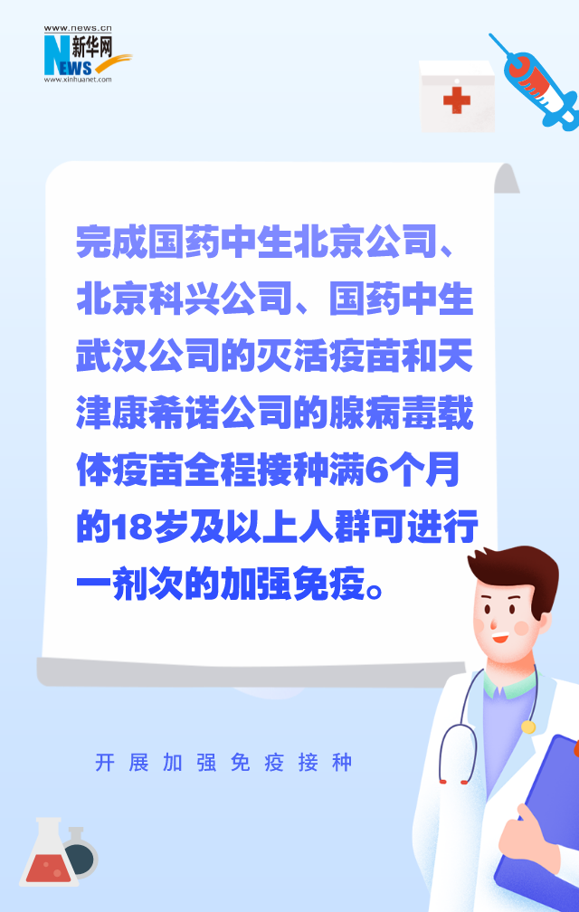 对此,国家卫生健康委疾控局副局长吴良有表示,根据专家研究论证结果和疫情防控需要,近日国务院联防联控机制启动了新冠病毒疫苗加强免疫接种工作,完成国药中生北京公司、北京科兴公司、国药中生武汉公司的灭活疫苗和天津康希诺公司的腺病毒载体疫苗全程接种满6个月的18岁及以上人群可进行一剂次的加强免疫。