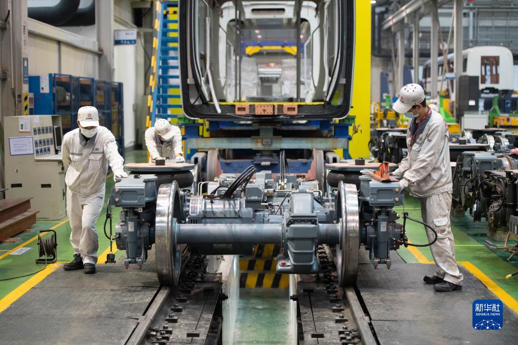 工作人员在位于湖南省株洲市的中车株机城轨事业部总成车间工作(2020年4月28日摄)。新华社记者 陈思汗 摄