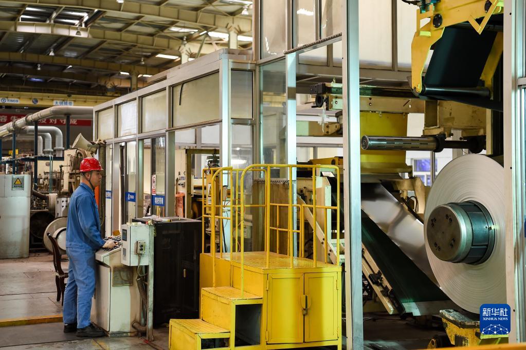 在位于山西省太原市的太钢不锈钢精密带钢公司,工人在操控宽幅精密带钢箔材的加工设备(2020年7月19日摄)。新华社记者 曹阳 摄