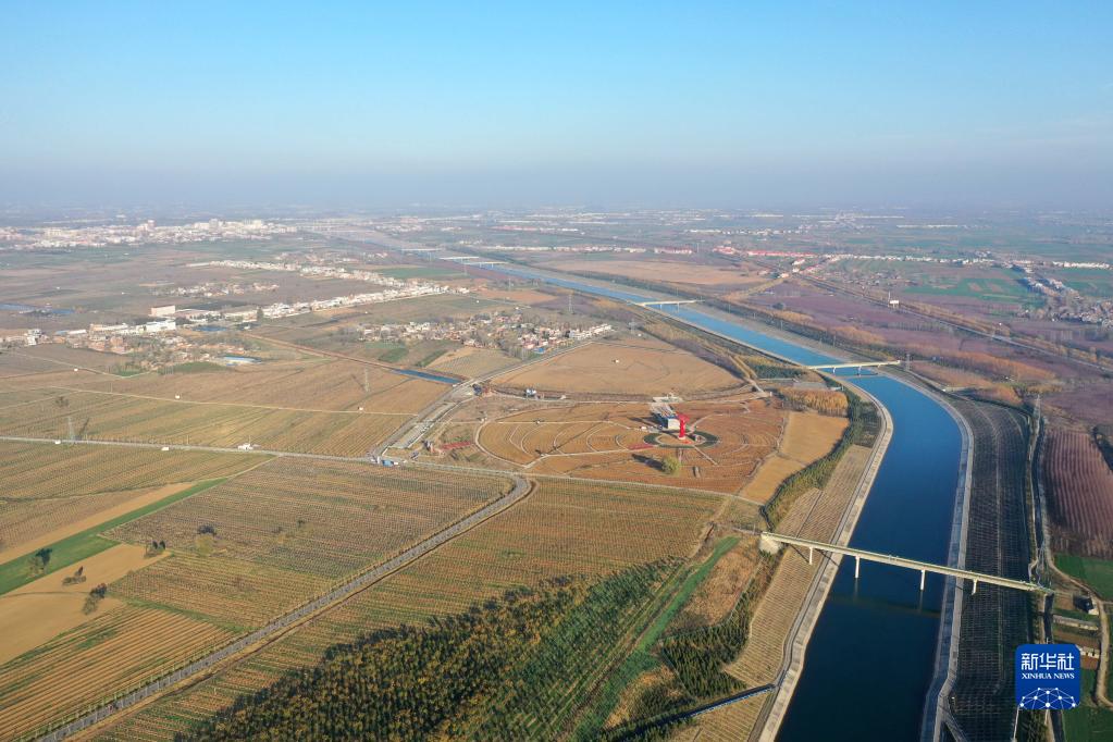 这是2019年12月9日拍摄的河南省南阳市淅川县九重镇张河村仁和康源软籽石榴基地,南水北调中线工程干渠从田间穿过(无人机照片)。新华社记者 冯大鹏 摄