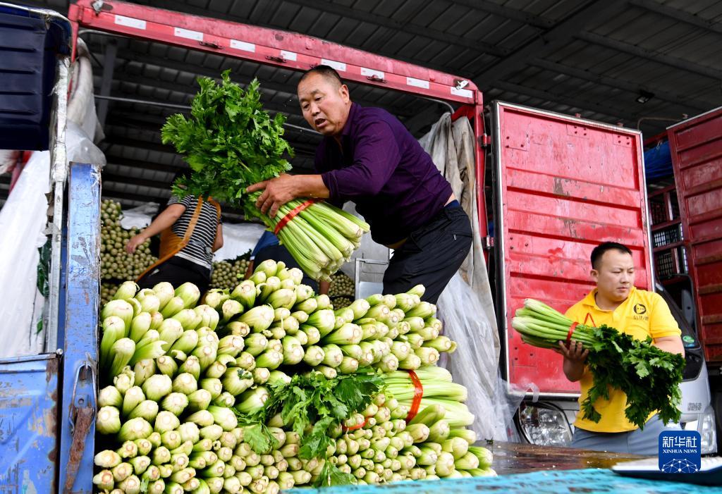 在位于河南省郑州市中牟县的河南万邦国际农产品物流城,工作人员在搬运蔬菜(2021年7月22日摄)。新华社记者 郝源 摄