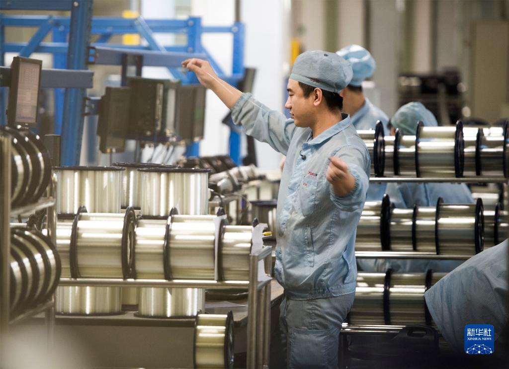 在位于湖北省武汉市的长飞光纤光缆股份有限公司光纤生产车间内,工作人员对光纤进行检测(2016年12月6日摄)。新华社记者 肖艺九 摄