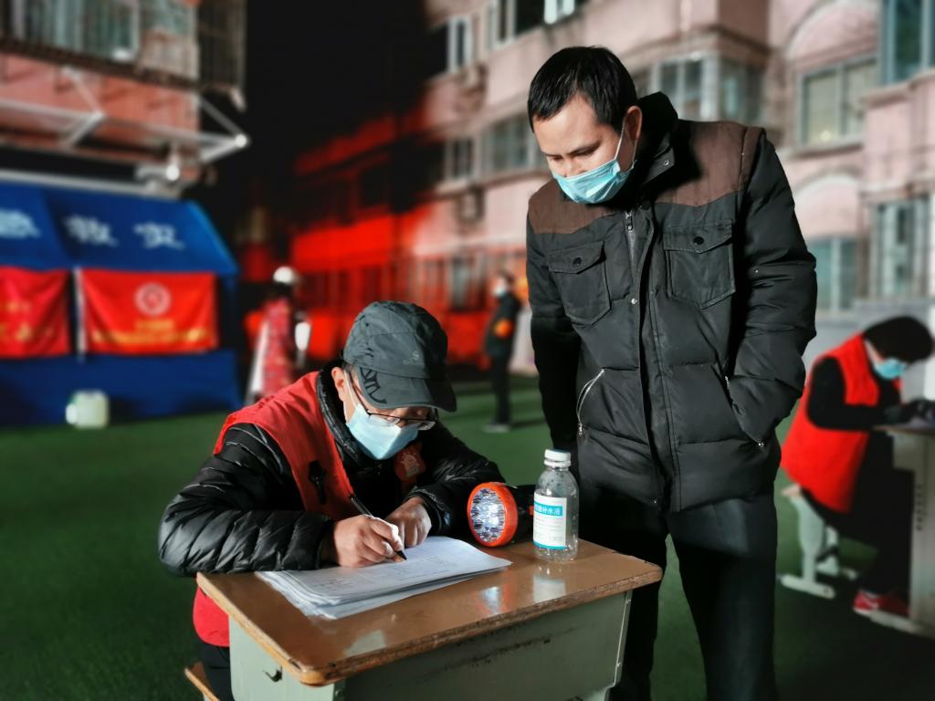24日晚11点,兰州市城关区酒泉路街道杨家园社区一位社区网格员在做核酸检测登记。(新华社记者何问 摄)