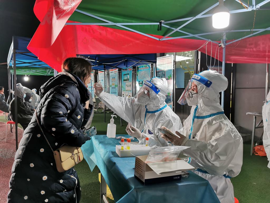 24日23时,医护人员在酒泉路街道杨家园社区居民做核酸采集,防护面罩笼罩着一层水汽。(新华社记者何问 摄)