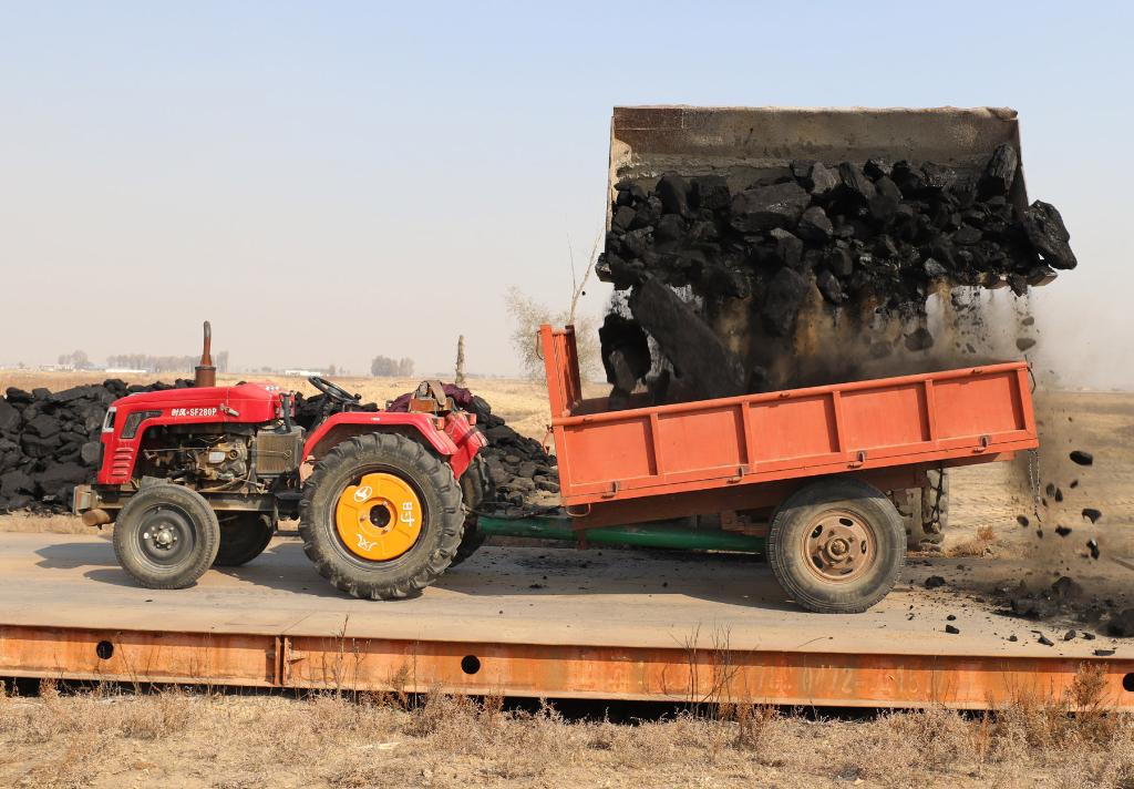 10月24日,达拉特旗海子湾村将旗政府送来的平价煤过磅称重,分发到户。(张倩 摄)