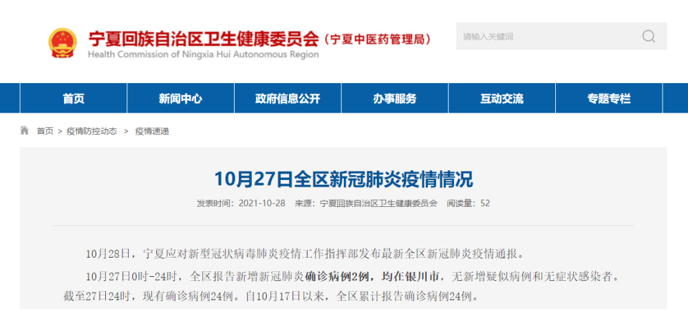 10月27日0时-24时,全区报告新增新冠肺炎确诊病例2例,均在银川市,无新增疑似病例和无症状感染者。截至27日24时,现有确诊病例24例。自10月17日以来,全区累计报告确诊病例24例。