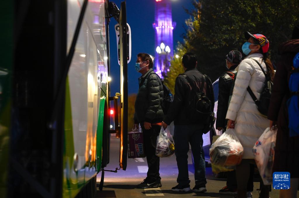 10月27日,滞留在额济纳旗的游客准备登大巴车前往额济纳站。新华社记者 贺书琛 摄