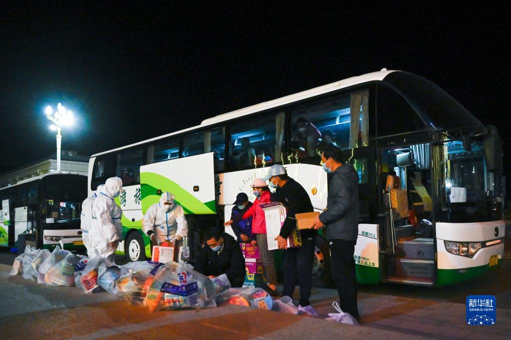 10月27日,滞留游客在额济纳站外领取食物等。新华社记者 贺书琛 摄