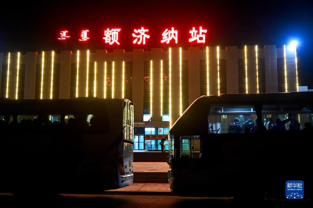 10月27日,搭载着滞留游客的大巴车停靠在额济纳站外。新华社记者 贺书琛 摄