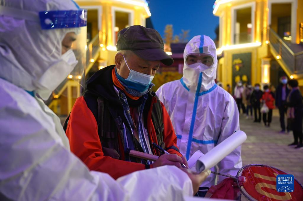 10月27日,滞留在额济纳旗的游客(中)返程前签字登记信息。新华社记者 贺书琛 摄