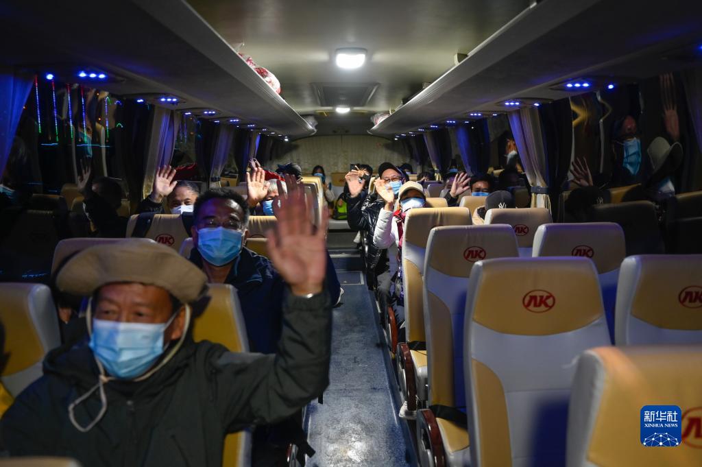 10月27日,滞留在额济纳旗的游客在大巴车上挥手致意。新华社记者 贺书琛 摄