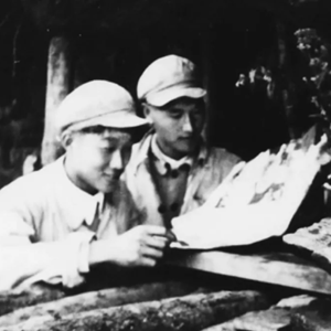 1951年朝鲜第5次战役期间,新华社记者李耐因随军(26军)采访,经常露营,写稿子也常是在树下、路边或临时搭起的棚子里。这是李耐因(右)在临时搭起的防空棚下,向军队参谋人员请教战况。