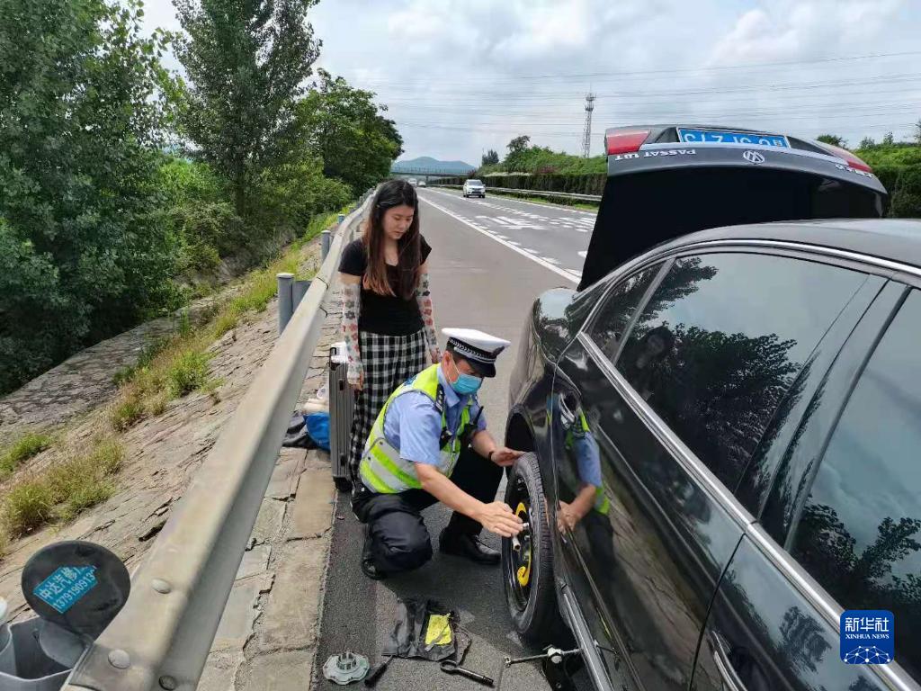 这是李涌(右)在执勤中帮一位车主换车胎(资料照片)。新华社发