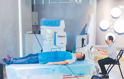 在重庆金山科技(集团)有限公司发布会现场,技术人员操作中国自主研发的RC100全自动导航胶囊机器人演示全自动胃镜检查。新华社记者 刘 潺摄