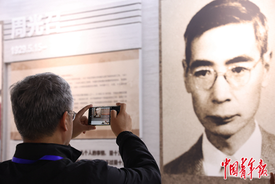 郭永怀的侄孙郭涛在拍摄郭永怀的照片和生前事迹介绍。
