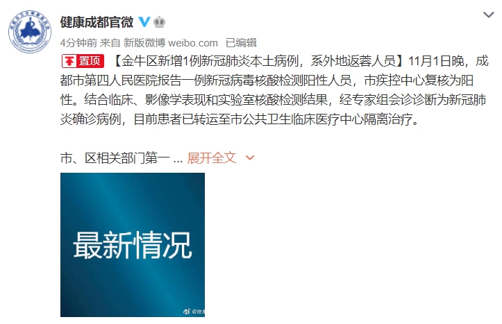 11月1日晚,成都市第四人民医院报告一例新冠病毒核酸检测阳性人员,市疾控中心复核为阳性。结合临床、影像学表现和实验室核酸检测结果,经专家组会诊诊断为新冠肺炎确诊病例,目前患者已转运至市公共卫生临床医疗中心隔离治疗。
