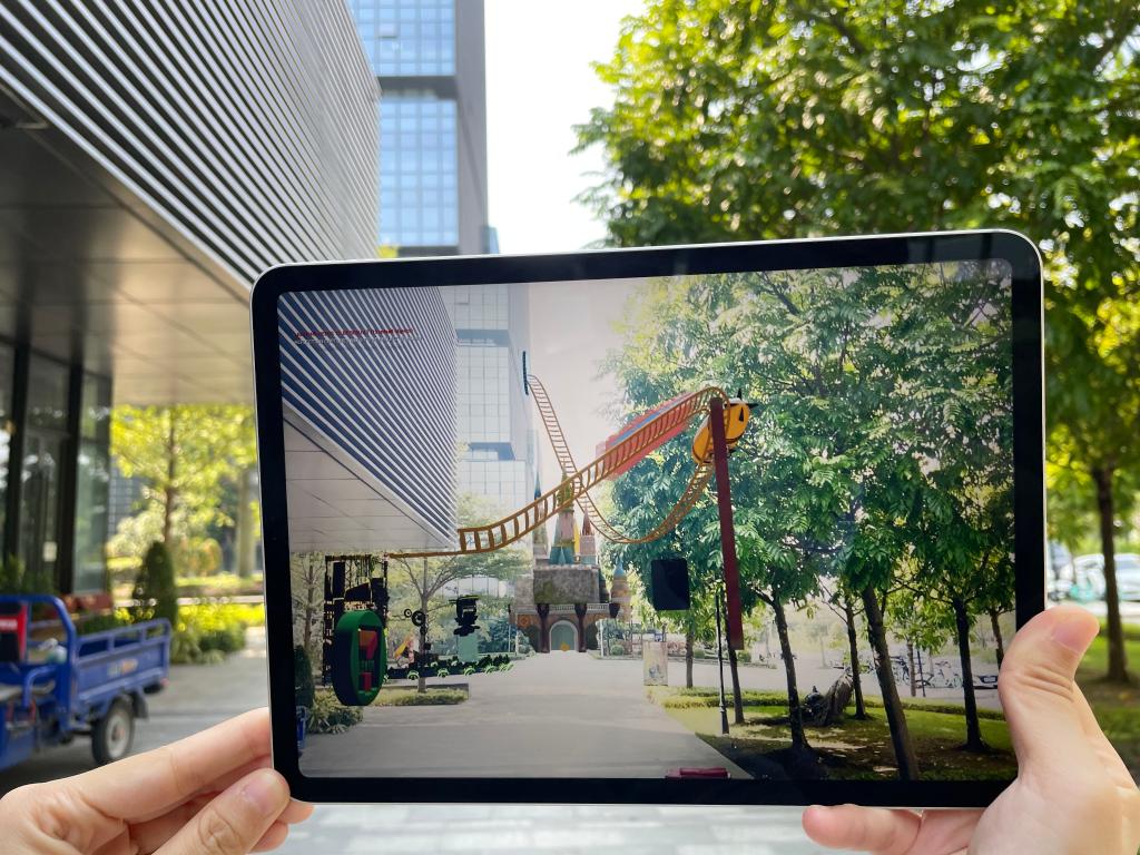宸境科技使用空间智能和虚拟现实技术,将一座设计出来的儿童游乐园叠加在公司办公楼实景之上。新华社记者 马晓澄摄