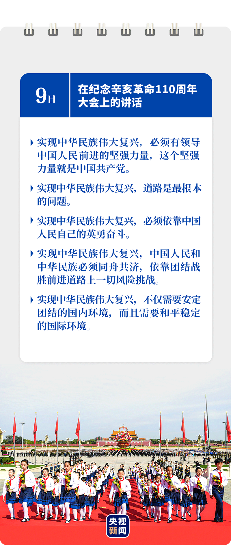在10月9日的纪念大会上,习近平总结了辛亥革命110年来的5点历史启示——