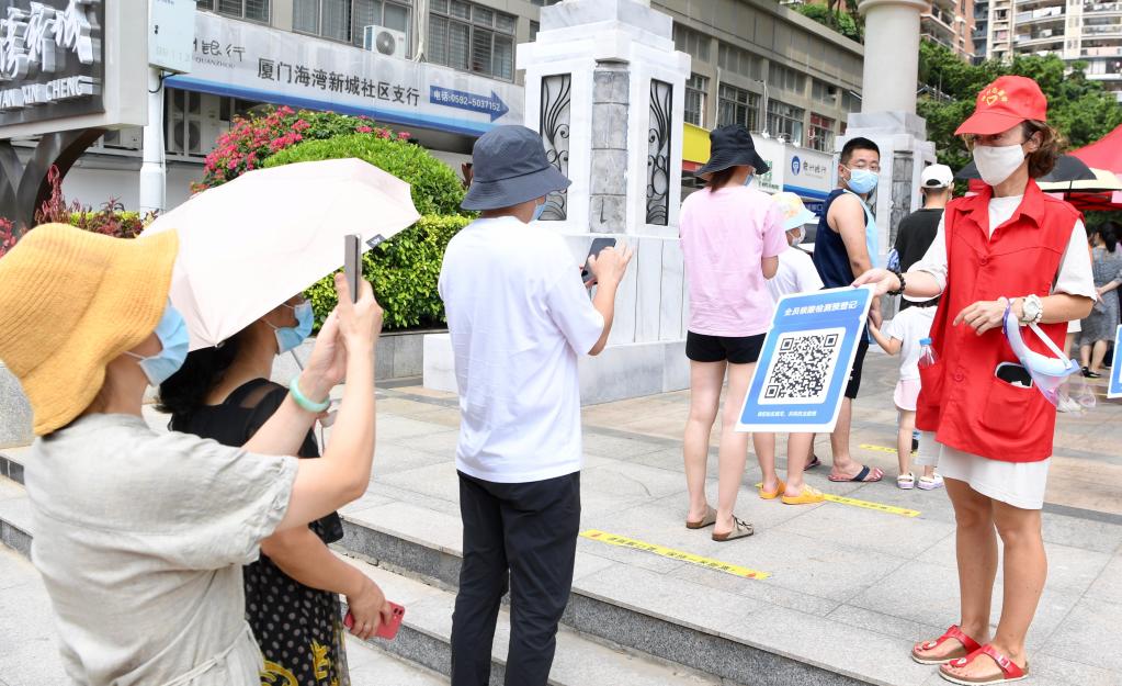 2021年9月18日,在厦门海湾新城核酸检测点,来自塞尔维亚的志愿者安娜(右一)在协助市民进行核酸检测扫码登记。新华社记者 姜克红 摄