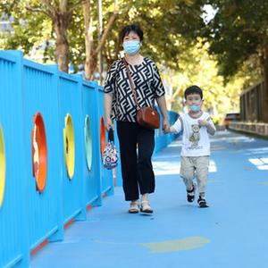 2021年8月30日,一名家长带着孩子在宁波市新城第一实验学校附近的“最美上学路”上行走。(受访者供图)