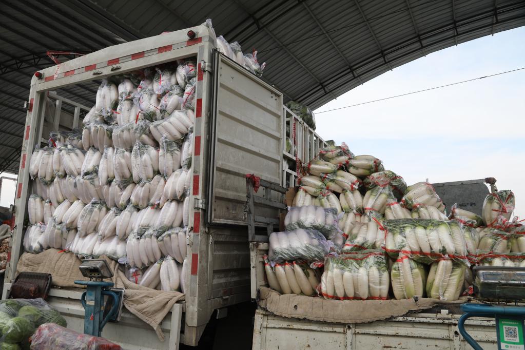 11月3日,在兰州国际高原夏菜副食品采购中心,蔬菜运输车辆上装满了萝卜。新华社记者 马莎 摄