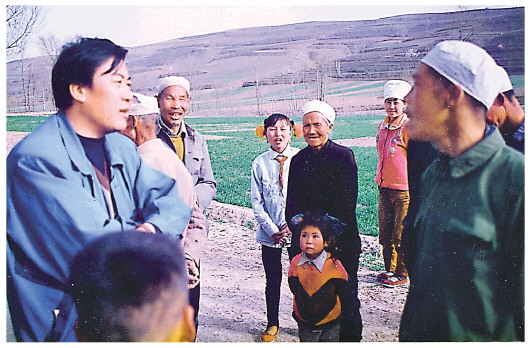 1995年4月,新华社记者张锦(左一)在调研西海固旱情时,来到泾源县大山深处的乡村采访,并与当地回汉族群众交谈。 刘泉龙摄