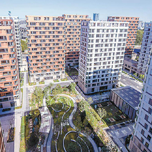 北京冬奥村橘黄、银白两种颜色的公寓楼错落有致排列在一起,颇有设计感。 记者 潘之望摄