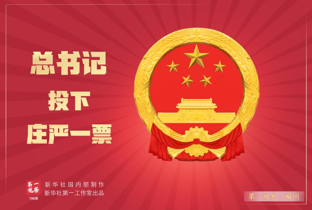 投票站内,悬挂的五星红旗鲜艳夺目,镶嵌着国徽的红色票箱端放正中。总书记身着正装,双手稳拿选票,在票箱前郑重投下一票。