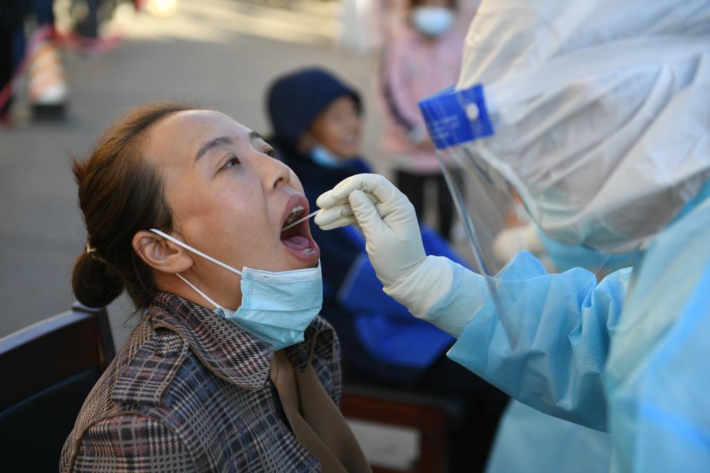 10月20日,在因疫情封控的内蒙古阿拉善盟额济纳旗达来呼布镇天赋佳苑小区内,医务人员为居民进行核酸采样。(新华社记者 贝赫 摄)