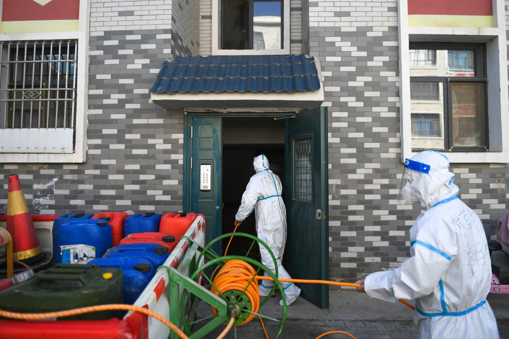 10月27日,在内蒙古阿拉善盟额济纳旗,包联干部进入达来呼布镇居延名郡小区单元楼进行消杀。(新华社记者 贝赫 摄)
