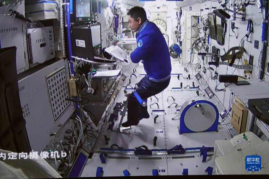 11月7日在北京航天飞行控制中心拍摄的神舟十三号航天员叶光富在核心舱内工作场景。新华社发(郭中正 摄)