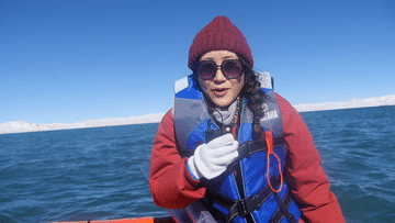 第一天早上,一路颠簸了近4个小时,我们一行抵达雀莫错。雀莫错是位于长江源头区域的一个较大的湖泊。当天,中科院青藏所的专家们需要在湖中心取水样。站在湖边,风特别大,阳光刺到睁不开眼。通过反复沟通,我们争取到了和专家一起上船采样的机会。为什么要上湖?在湖边出个镜不香吗?因为我始终相信,要拍到生动的一手资料,那就得离得足够近。