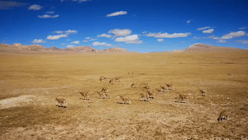 羌塘草原,平均海拔超过4700米。由于自然条件恶劣,这里被称为“人类生命的禁区”,但却是野生动物的乐园。记者穿过羌塘草原,路遇一群藏羚羊。新华社记者 董琳娜 摄