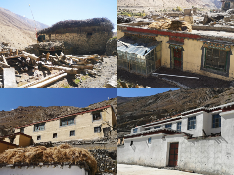楚松村“四代房”拼图。左上图的土坯房是“第一代”,右上图的土木房是“第二代”,“第三代”是左下图的砖石房,右下图是崭新的两层独家院落,为“第四代”。新华社记者 董琳娜 摄