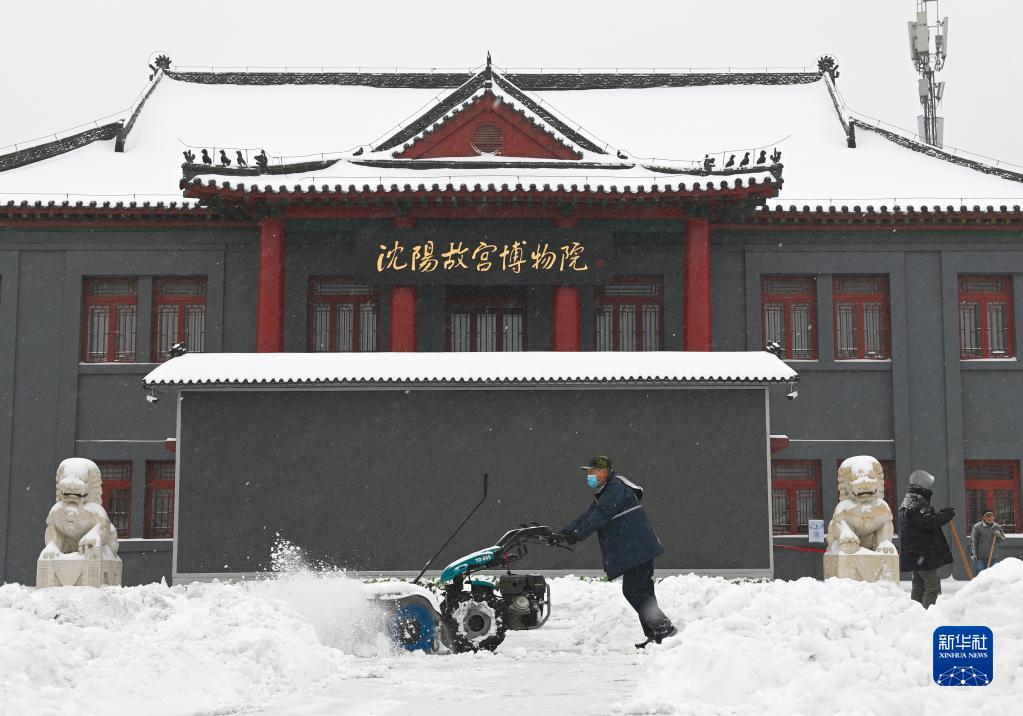 11月8日,在位于沈阳市沈河区的沈阳故宫门前,保洁人员在清理积雪。新华社记者 蔡湘鑫 摄