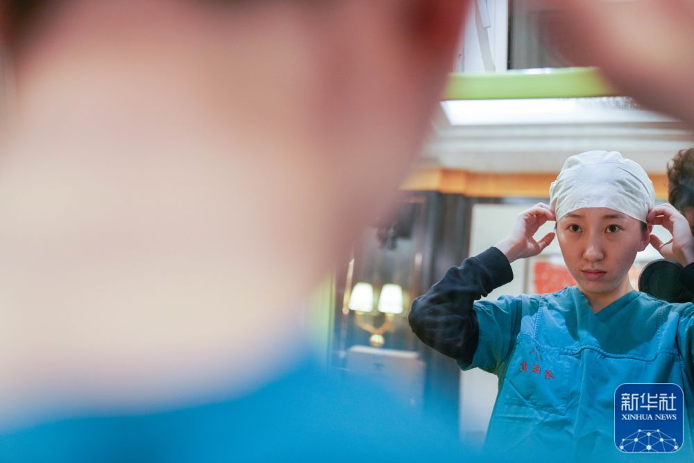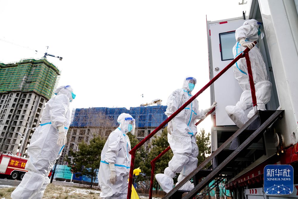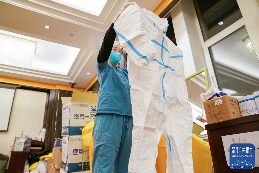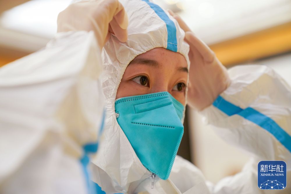 ↑刘冰在“火眼”移动方舱实验室驻地更换隔离服(11月14日摄)。