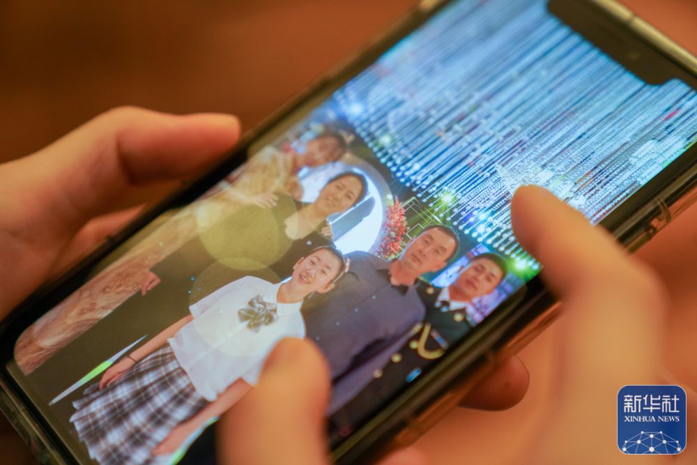 ↑刘冰在“火眼”移动方舱实验室驻地端详手机中家人照片(11月14日摄)。