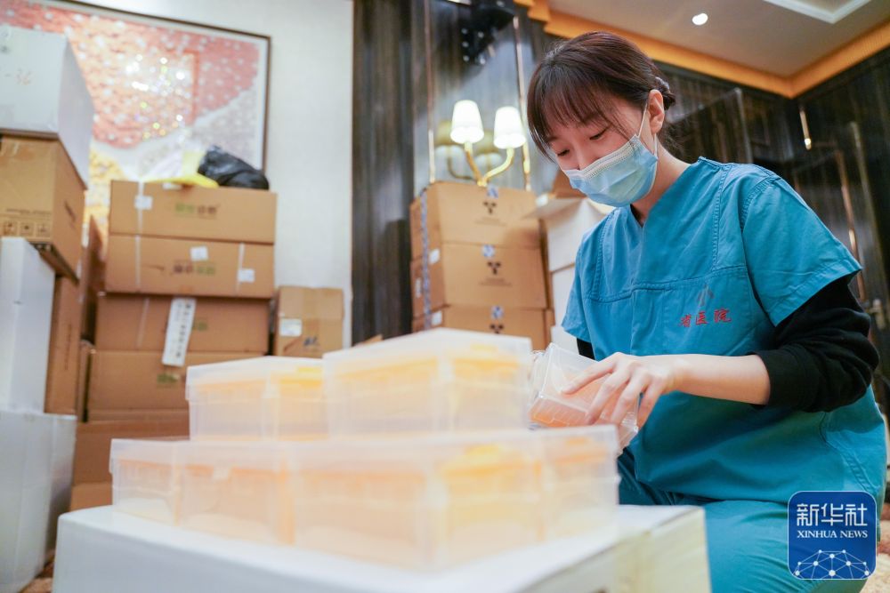 ↑刘冰在“火眼”移动方舱实验室驻地准备进舱医用物资(11月14日摄)。