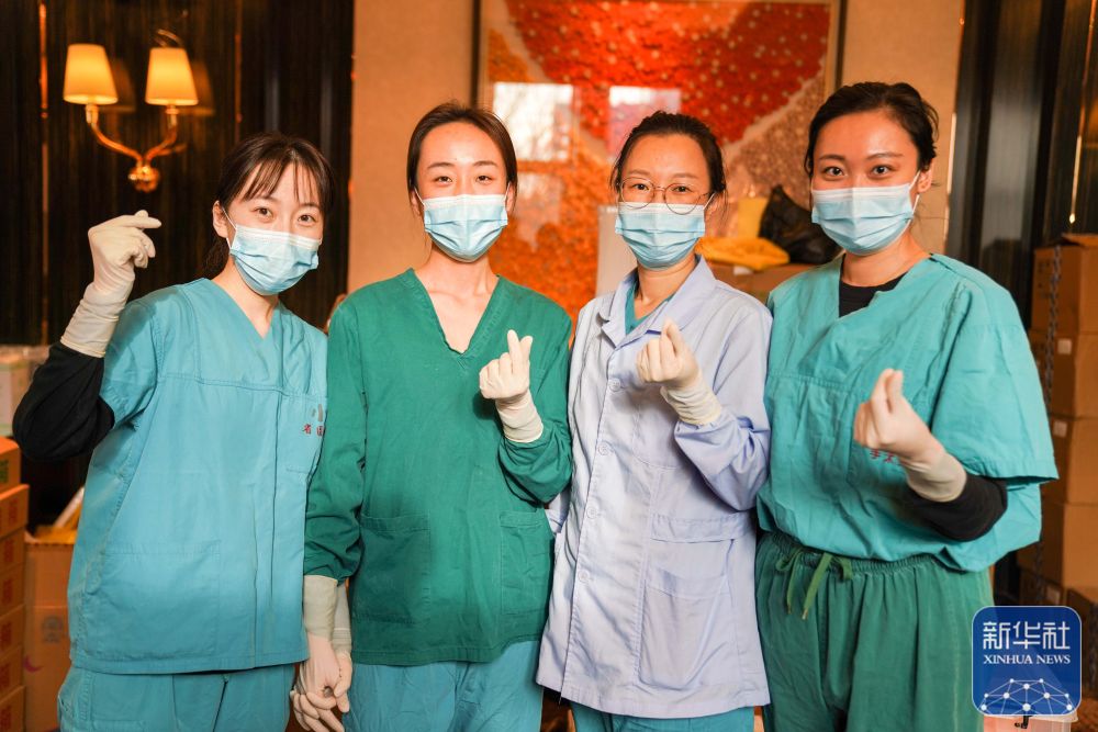 ↑刘冰(左一)在“火眼”移动方舱实验室驻地与同事合影(11月15日摄)。