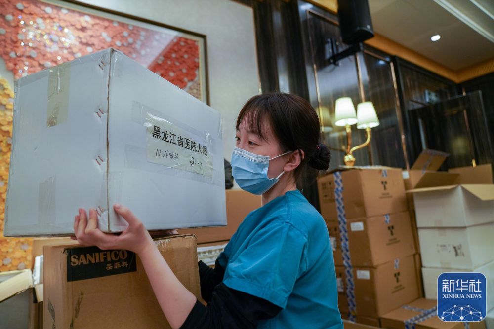 ↑刘冰(右)在“火眼”移动方舱实验室驻地准备进舱医用物资(11月15日摄)。