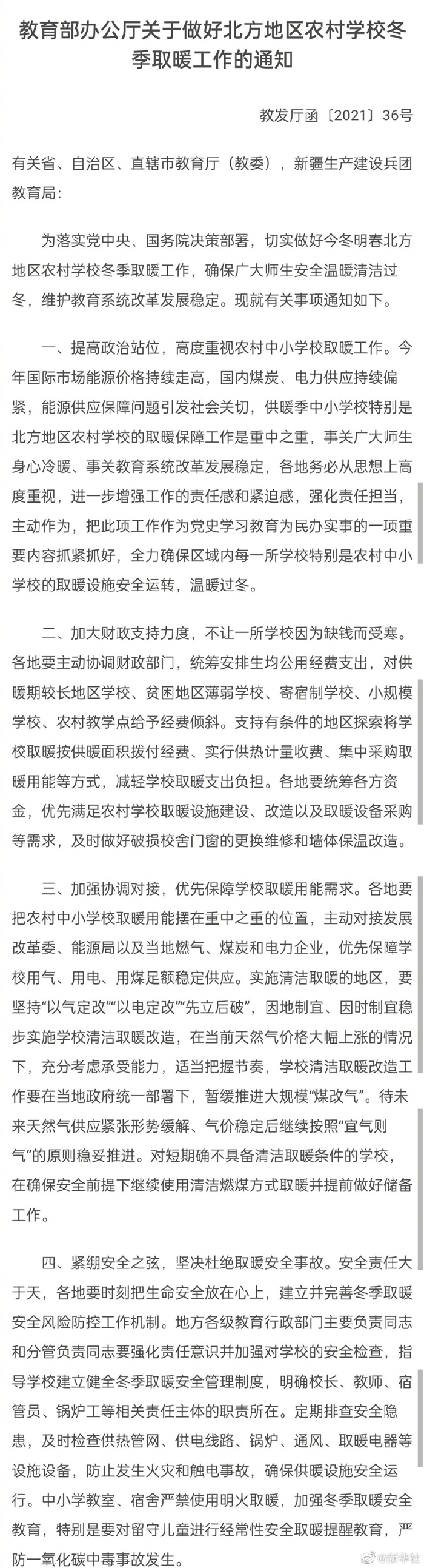 记者17日从教育部获悉,教育部近日印发通知,要求做好今冬明春北方地区农村学校冬季取暖工作,确保广大师生安全温暖清洁过冬。通知指出,要加大财政支持力度,不让一所学校因为缺钱而受寒。通知强调,要紧绷安全之弦,坚决杜绝取暖安全事故,中小学教室、宿舍严禁使用明火取暖,加强冬季取暖安全教育。(记者余俊杰)