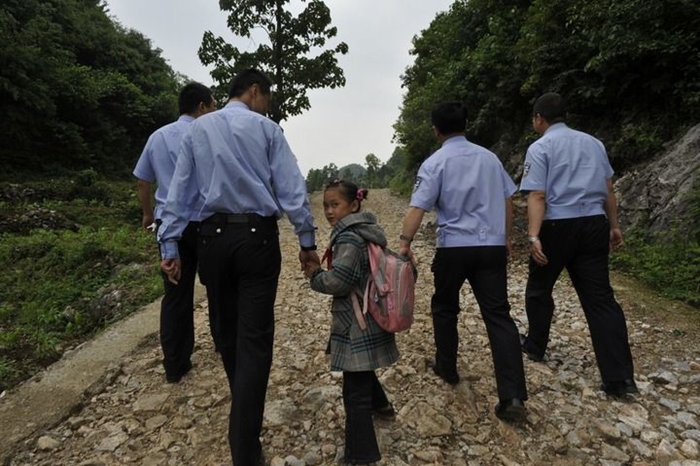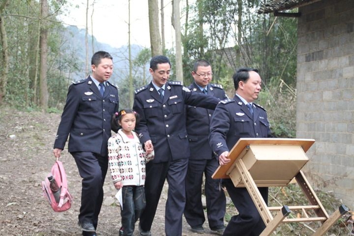 2012年5月15日,杜海英和四位“爸爸”在回家路上。(长顺县公安局交警大队供图)
