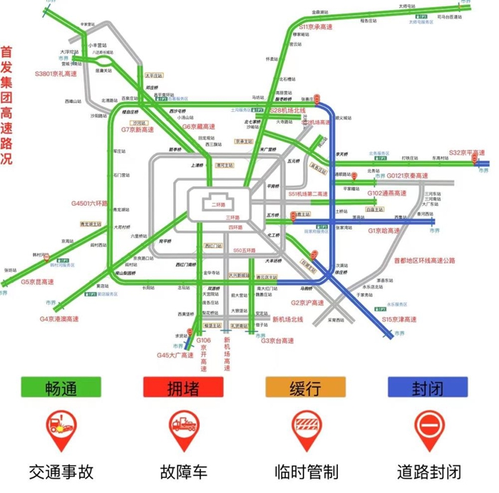 S32京平高速双向南太务至市界封闭,出京车辆由南太务出口驶出,南太务双向入口封闭。