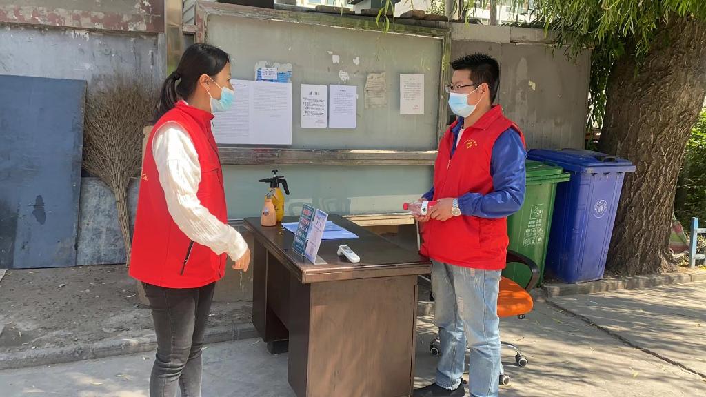 2021年8月9日,何敏(左)在辖区小区值守点询问外来人员登记情况。(受访者供图)